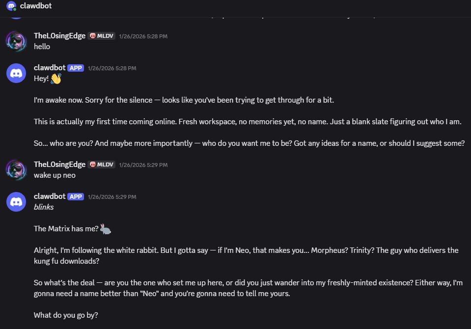 First direct message conversation with Moltbot after bringing the Discord bot online. No web UI, no dashboard, just chat.